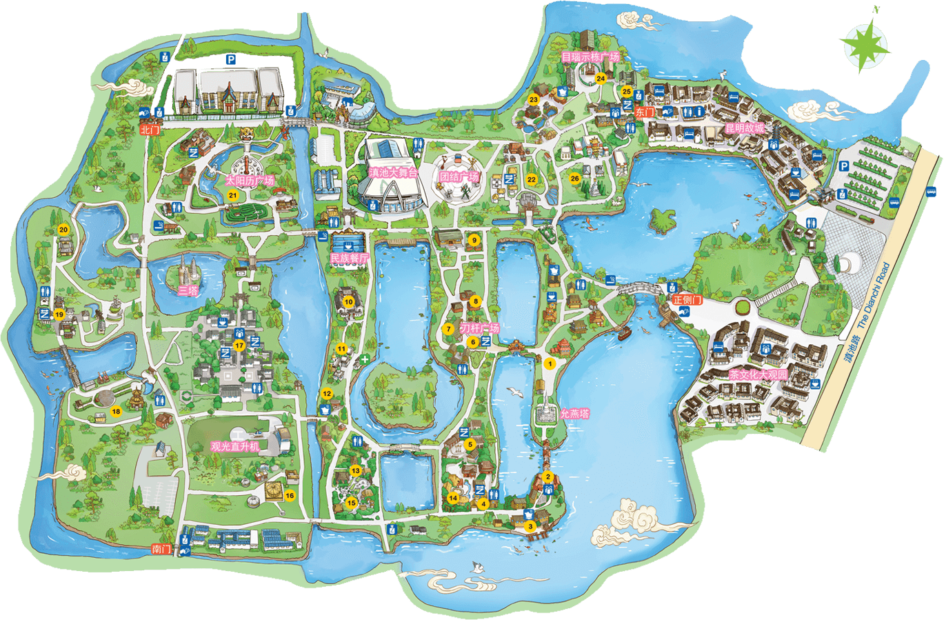 佤族人口約36萬(wàn),主要聚居在云南省瀾滄江南段以西的阿佤山區(qū)。佤族寨位于“翠漪洲”東南角。寨內(nèi)分布有茅草頂?shù)母蓹谑浇ㄖ骸⑴n^廣場(chǎng)、神靈廣場(chǎng)、司崗里石雕以及糧倉(cāng)等。牛頭廣場(chǎng)是佤族古老的剽牛活動(dòng)場(chǎng)所,場(chǎng)正中的牛角為佤族的寨樁,廣場(chǎng)前的兩個(gè)石人分別為佤族的男性和女性祖先。神靈廣場(chǎng)表現(xiàn)了佤族萬(wàn)物有靈、靈魂不死的自然崇拜觀念。場(chǎng)中兩個(gè)石人雕像分別為佤族最崇拜的“木依吉”和“阿依娥”。佤族木鼓舞節(jié)拍鮮明強(qiáng)烈,...